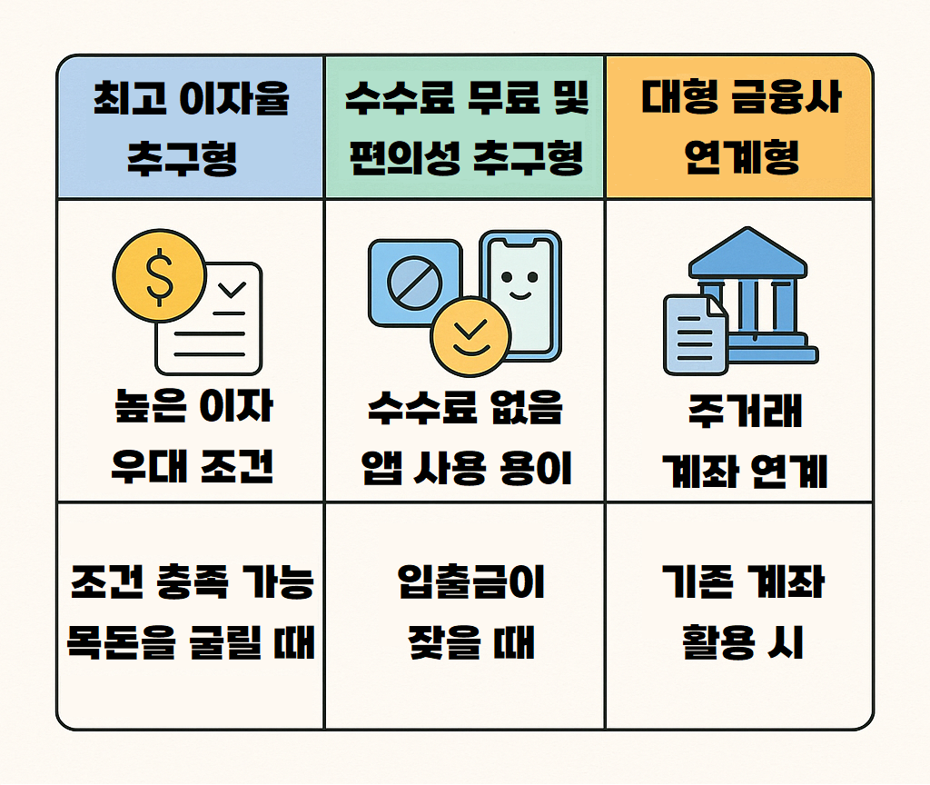 파킹 통장 유형별 비교표. 최고 이자율형, 수수료 편의성형, 대형 금융사 연계형 특징 요약