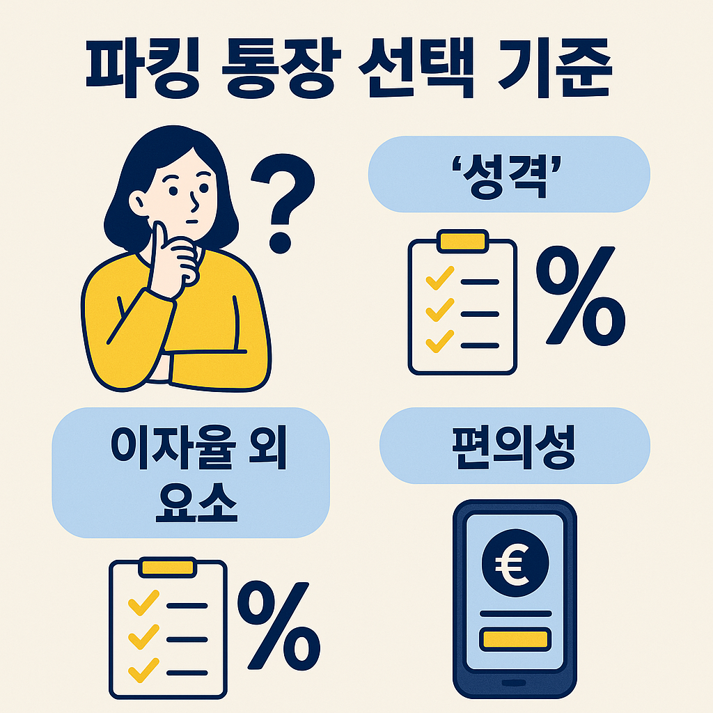 파킹 통장 고르는 방법을 소개하는 블로그 대표 이미지. 3단계 체크리스트와 금리 혜택 시각화